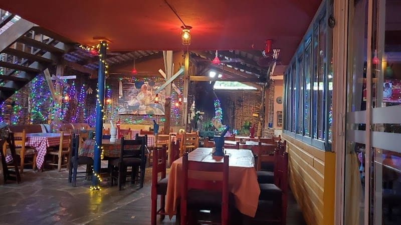 Restaurante de grandes porciones de estándares dominicanos, como platos de mariscos, cerdo y plátanos en entorno colorido.