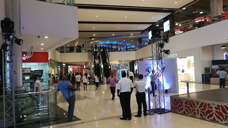 Centro comercial animado con minoristas, un supermercado, sala de cine y diversas opciones gastronómicas.